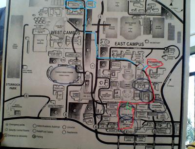 Hier habe ich euch das mal in Rot aufgezeichnet.. International House (da wohne ich drin) die eingekreisten Gebäude sind meine Gebäude, wo ich VL und TUT drin habe.